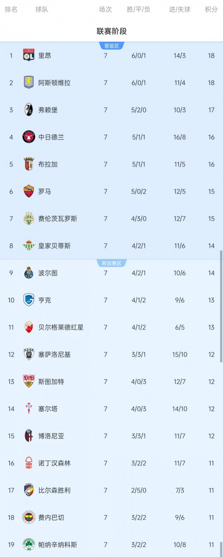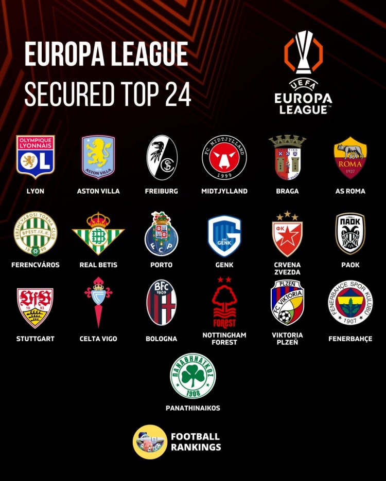 直播吧1月23日讯 欧联杯联赛阶段第7轮比赛战罢,Football Rankings列出了已经晋级16强或附加赛的球队。