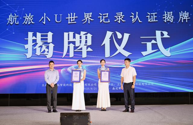 发布会现场,重庆商界传媒集团董事总经理崔光灿与益航科技创始人金洋共同为“航旅小U世界纪录认证”揭牌。该认证由权威机构“商界世界纪录”颁发,标志着航旅小U正式登上国际舞台,引领全球航旅媒体数智化变革。
