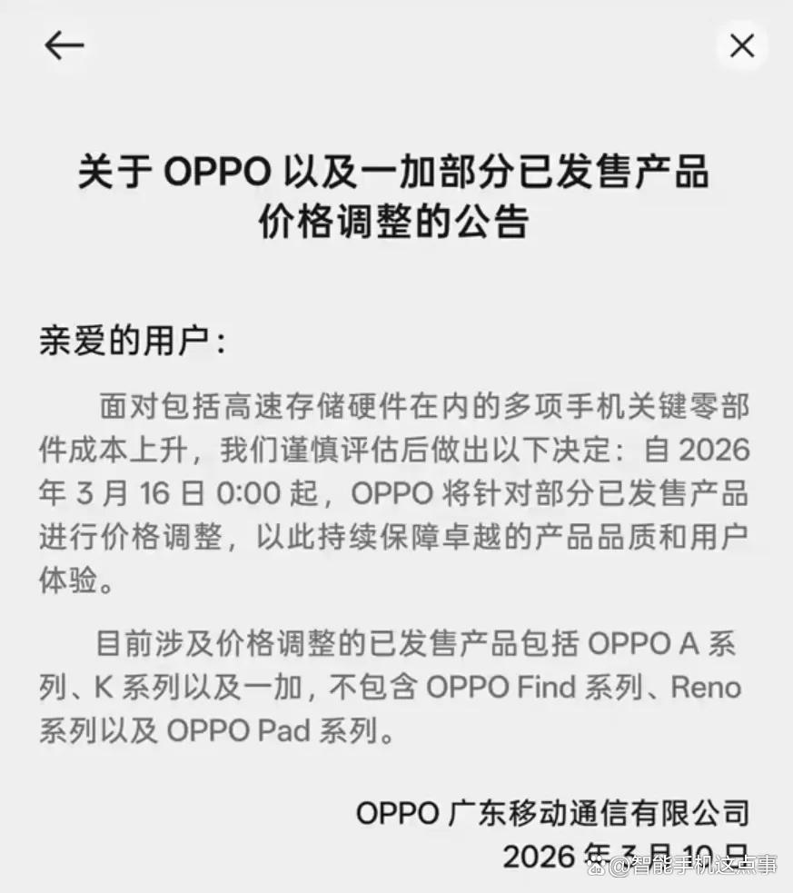 先看OPPO这次的具体操作,公告里写得挺委婉,面对包括高速存储硬件在内的多项手机关键零部件成本上升,谨慎评估后做出决定。