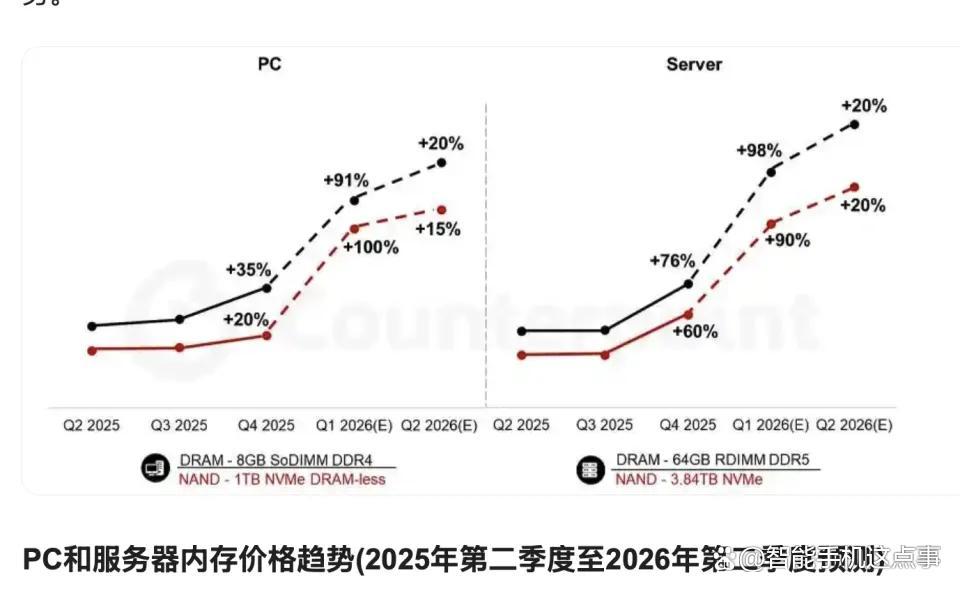 以主流型号DDR4 8Gb颗粒为例,现货价格从2025年低点的3.2美元飙升至15美元,累计涨幅高达369%。关键笔者发现Counterpoint的报告更狠,2026年一季度内存价格环比涨80%-90%,NAND闪存同步涨80%-90%,这直接导致手机BOM成本飙升。
