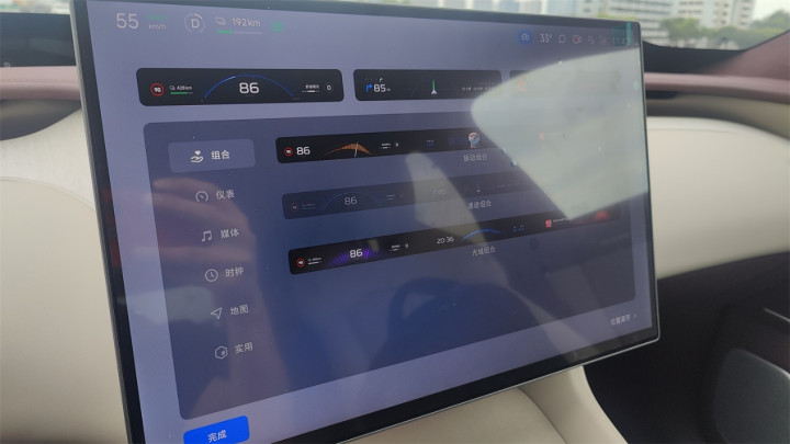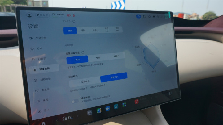 动能回收默认只提供了两个档位、以及一个自定义档位,差异性会有点大,个人推荐柔和状态,能够提供接近于燃油车丢开油门之后非常微弱的减速感,开起来更舒服自然;标准模式下虽然接入的顿挫感有所减弱,但是减速度比较大,有很明显的拉扯感,平时用容易晕车。