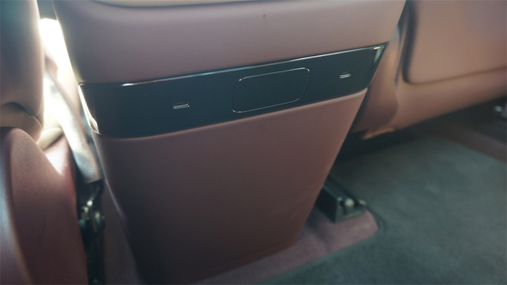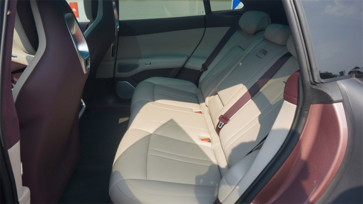 由于坐垫的垂直安装位置更高,坐垫长度也比较充裕,所以后排的大腿承托性比SU7好了不少。而且还有非常夸张的大角度可调靠背,调到最末端的角度时几乎等同于半躺坐姿,脑袋已经可以直对车顶了,可见靠背角度有多夸张。