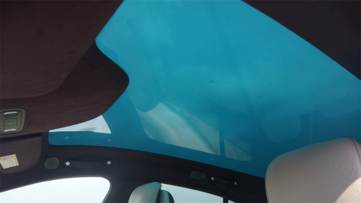 没有遮阳帘的YU7,在顶配上增加了可变色的全景天幕。然而和极氪001一样,透光状态下天幕看起来泛着偏绿的蓝色,观感稍显一般。遮光效果下的灰黑色效果会更好一些。从透明状态到遮光状态大约需要几分钟的时间,变色的过程如同水墨画染色一般,看起来感觉有点奇怪。