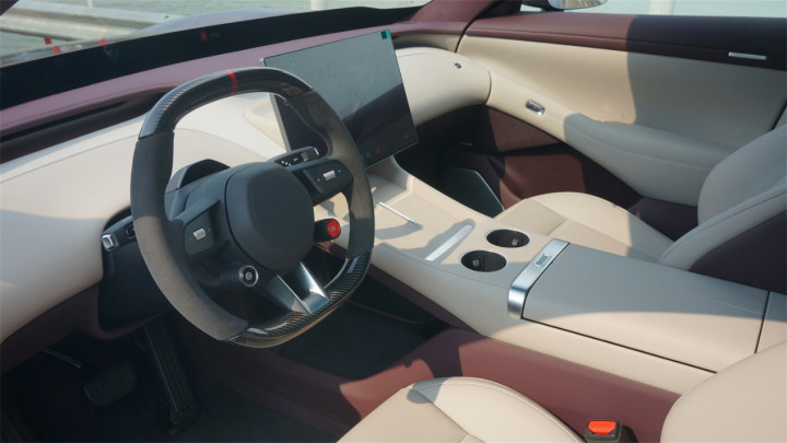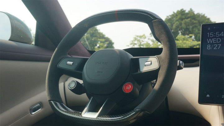 方向盘保持了SU7的造型基础,同时细节上也有了更多变化。六边形的气囊罩盖变得更简洁。控制巡航功能和驾驶模式的独立控件也被保留了下来,甚至弹射模式的按键直接变成了更抓眼球的全红色样式。不过方向盘左右两侧的控件样式进行了简化,包括滚轮和左右按键都变得更简单了,运动感没有SU7上那么强烈了。