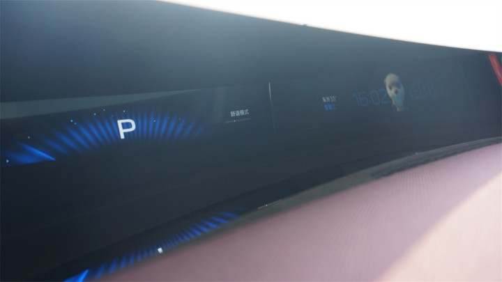 取代SU7上更类似于噱头的翻转屏,这条长长的“天际屏”P-HUD,成为了YU7上含金量比较高的技术亮点之一。实际上它的原理很简单,就是通过三块拼接的屏幕播放HUD的影像,然后投影到前风挡下方加长加粗的黑色部分,再反射入人眼成像。在特定的角度下,你甚至可以看到三块小屏幕中间的分界线。