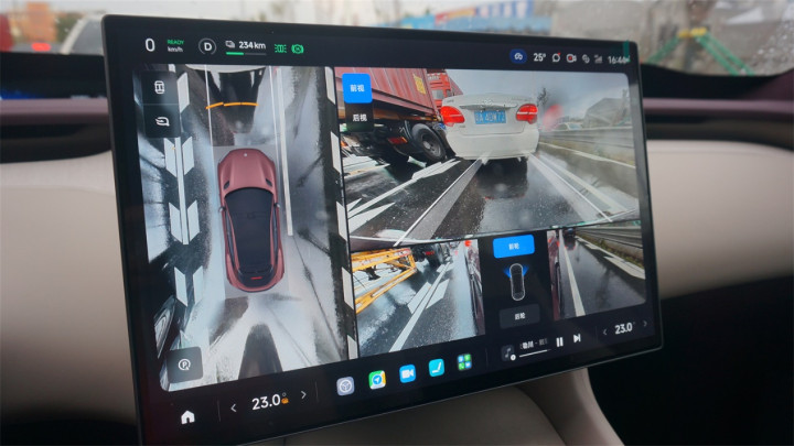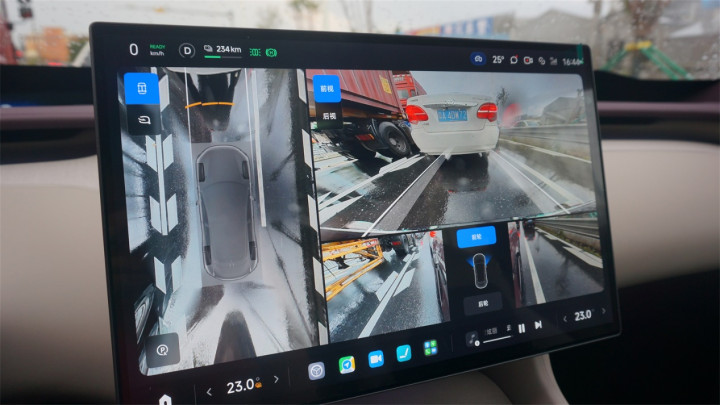另外,360全景的拼接也做得不够精细,车辆俯视的贴图上甚至还保留着完全不透明的四轮四角位置。