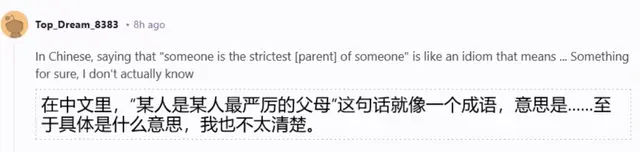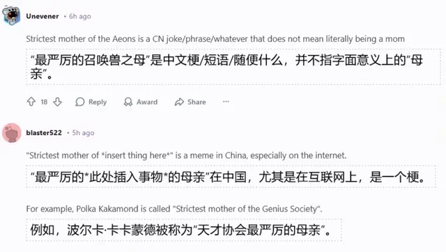 不过在老外的角度,他们并不知道虚照介绍中说的母亲是这个意思,评论区的发言都被带歪了,还真讨论起母亲型的角色,但是很快就有其他玩家指出,在中文语境下,“某某最严厉的母亲”并不是真的指母亲,不过由于不了解中文,具体意思并不清楚。