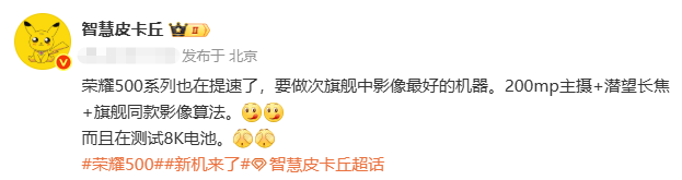 近日配资官网开户,知名博主@智慧皮卡丘 发布消息透露:“荣耀500系列也在提速了,要做次旗舰中影像最好的机器。200mp主摄+潜望长焦+旗舰同款影像算法,而且在测试8K电池”。根据网友们的评论,以及该博主的回复,荣耀500系列将在今年年底发布,预计11月底或者12月中旬。
