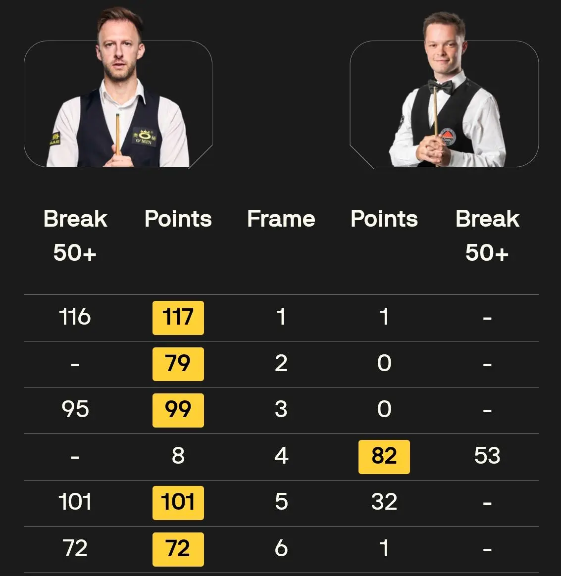 第五局,特鲁姆普单杆101分以101:32赢下此局4-1领先努塞尔率先拿到赛点。第六局,特鲁姆普单杆打出72分以72:1拿下此局从而5-1击败努塞尔。