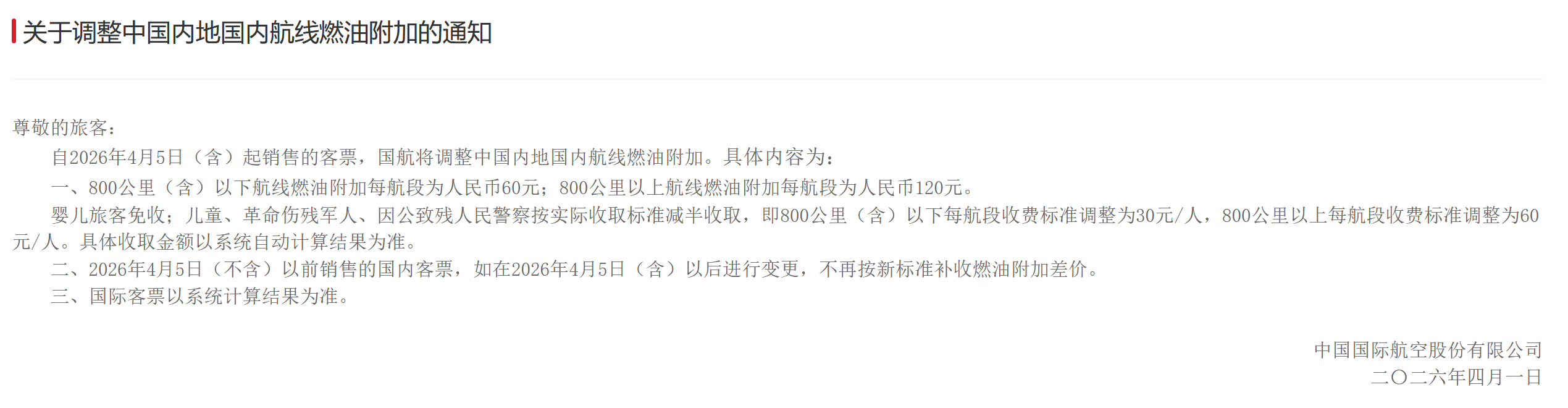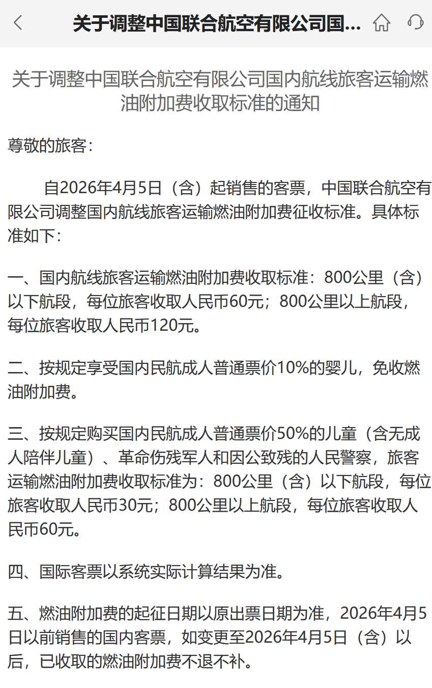 自2026年4月5日(含)起销售的客票,国内航线旅客运输燃油附加费收取标准调整为:800公里(含)以下航段,每位旅客收取人民币60元;800公里以上航段网上配资网站,每位旅客收取人民币120元。